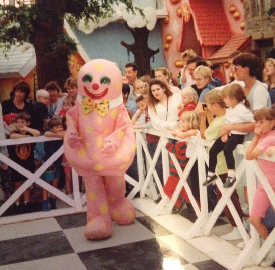 Home videos and photos of Blobbyland tend to show Mr Blobby and his wife Mrs Blobby waving from the building's balcony, or prancing around in the makeshift chequerboard courtyard of the venue. With a simple white fence to stop children running into the performance space, the Blobby family would greet visitors and stop for photos.